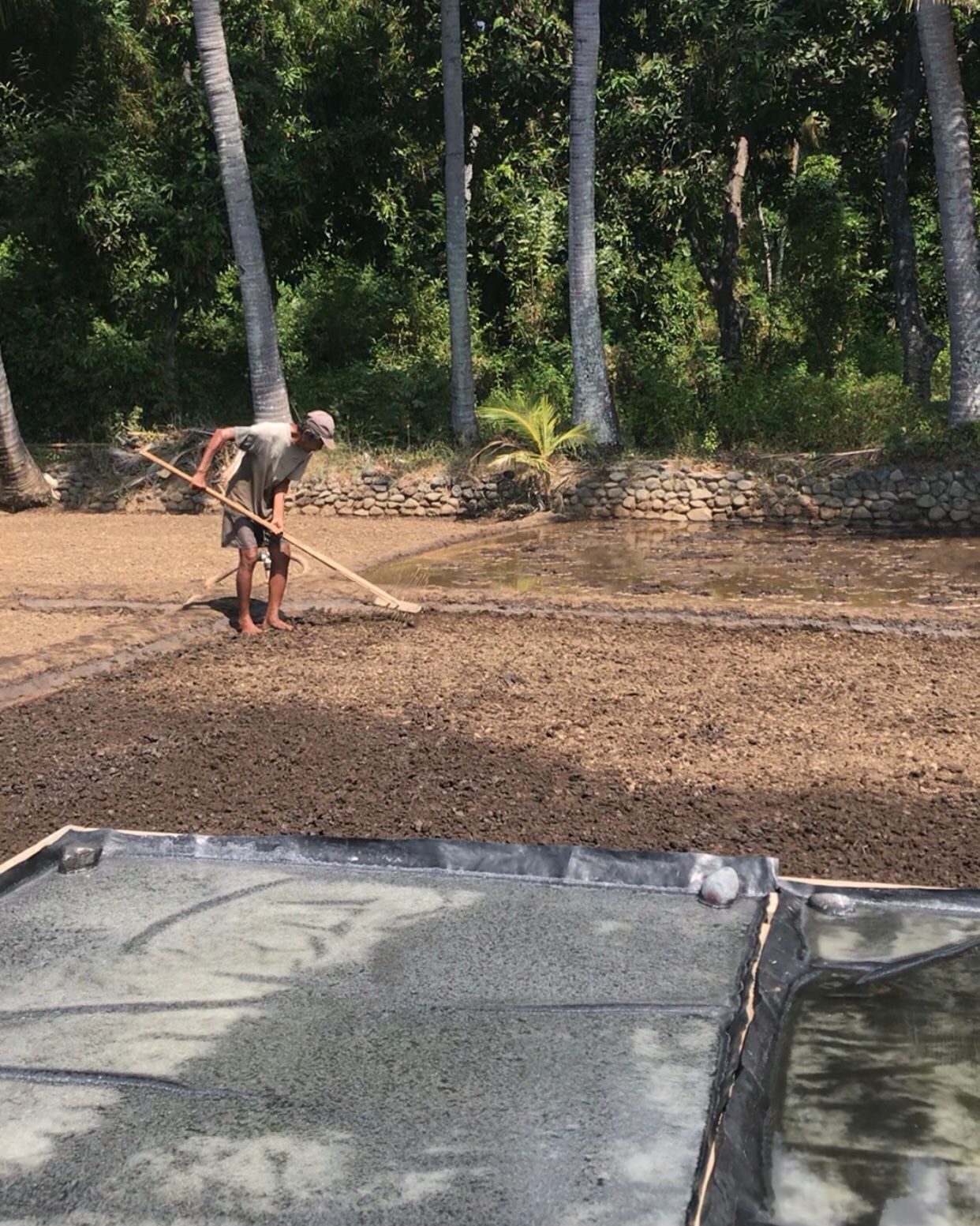 The process is entirely manual and eco-friendly. It begins by preparing plots of soil, watering them with seawater, then softening the surface using a wooden tool called bangkrak. The brine is then filtered through tinjung bamboo and left to evaporate for three days until crystals form. Once harvested and drained, the result is pure, mineral-rich salt, naturally containing magnesium, calcium, and potassium.